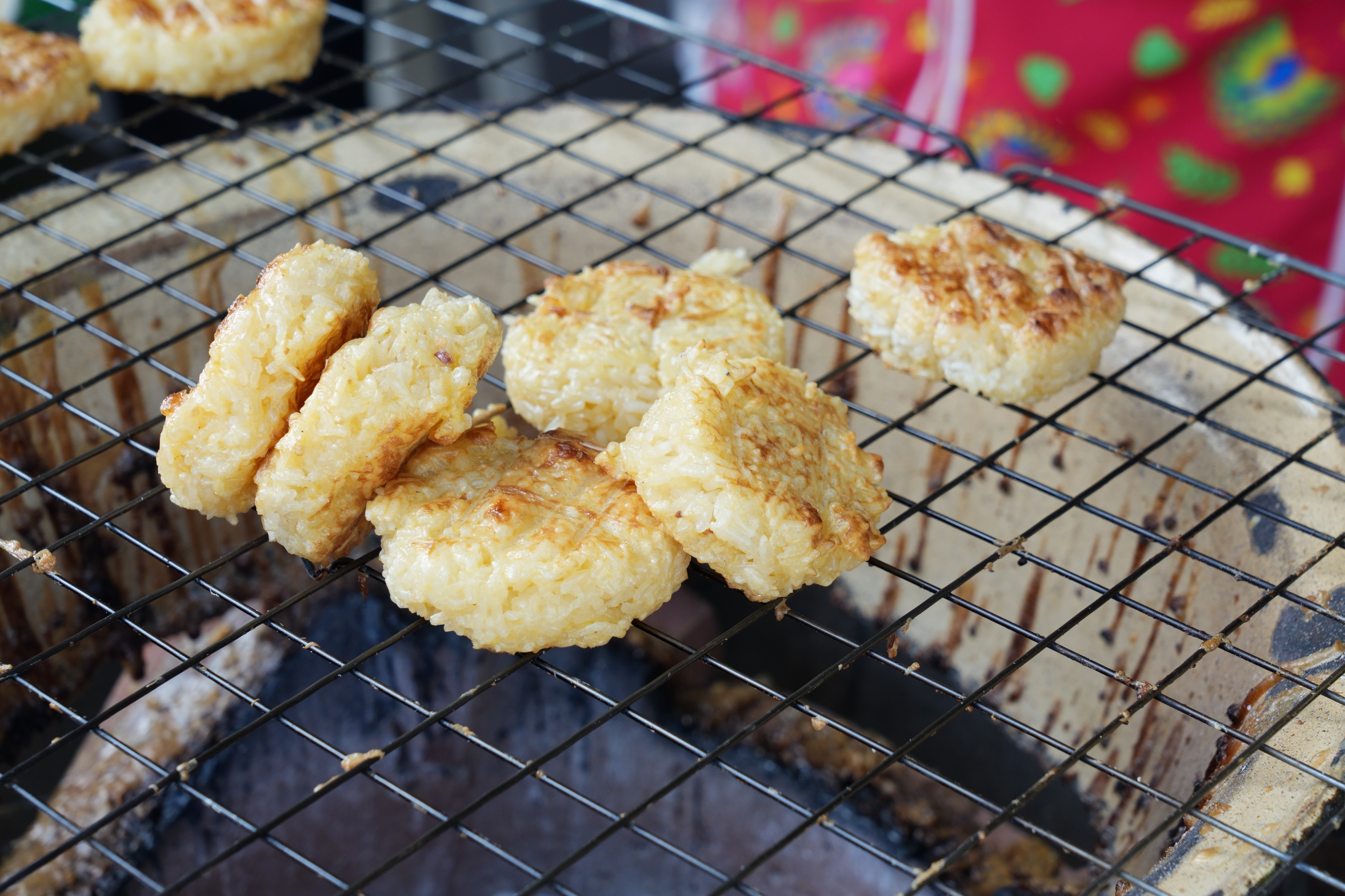 また、街の各所で見かけるのがカオチーを売る露店。カオチーは蒸したモチ米で作る焼おにぎりのような料理で、シンプルに塩や醤油のみの味付けもあれば、仕上げに溶き卵を塗ったものもあります。手軽なおやつとして親しまれていて、バンコクなどの大都市では味わえない、田舎町ならではの素朴な魅力が感じられます。