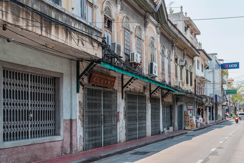 この辺りには、かつて川の港で荷を扱っていた商人の家や倉庫が今も多く残ります。木の扉や古い看板、使い込まれた壁が、タラートノイが商いの街だったことを静かに伝えています。
